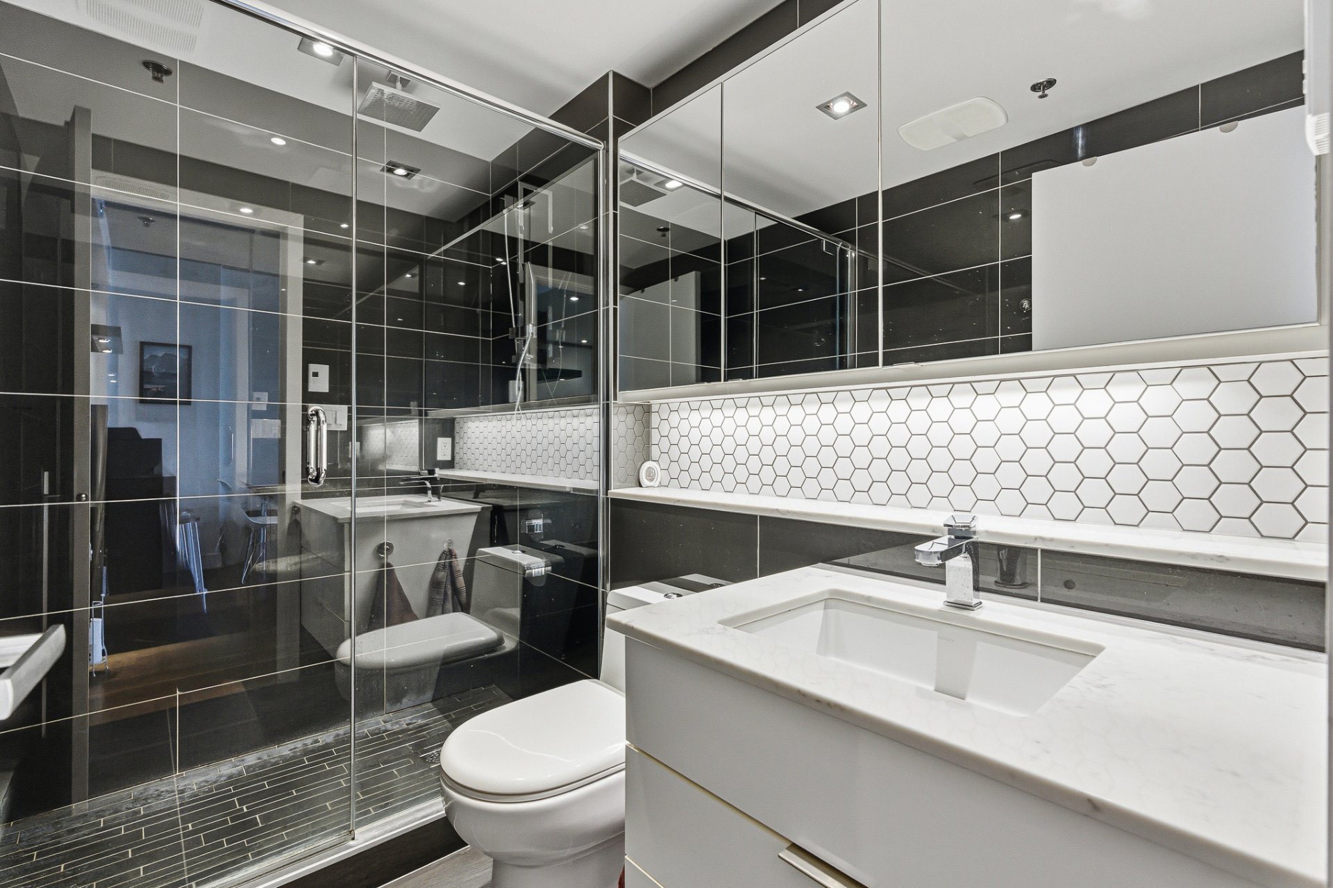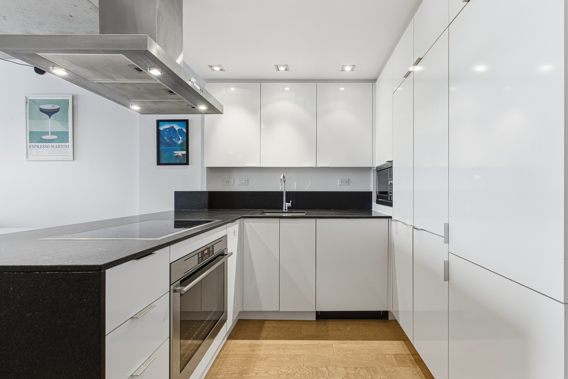 sleek cabinetry, quartz countertops, and efficient