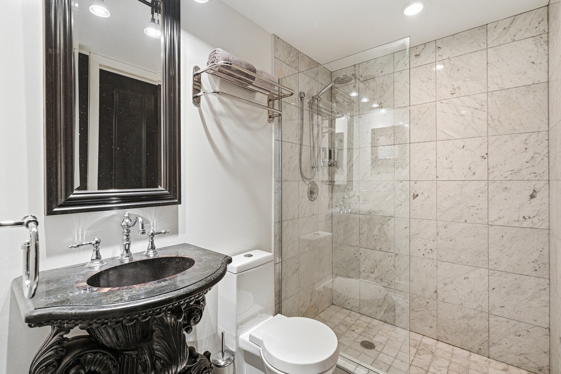 separate glass-enclosed shower, adds comfort and
