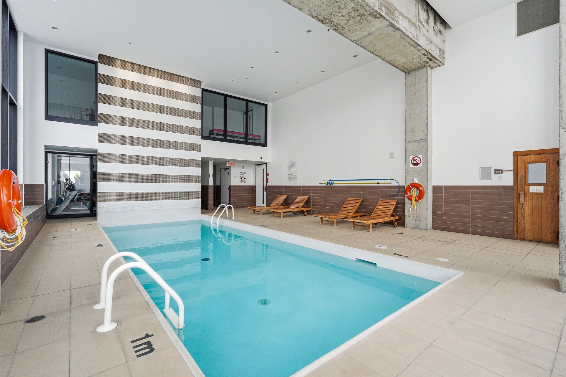 an indoor pool surrounded by large windows, a sauna, a